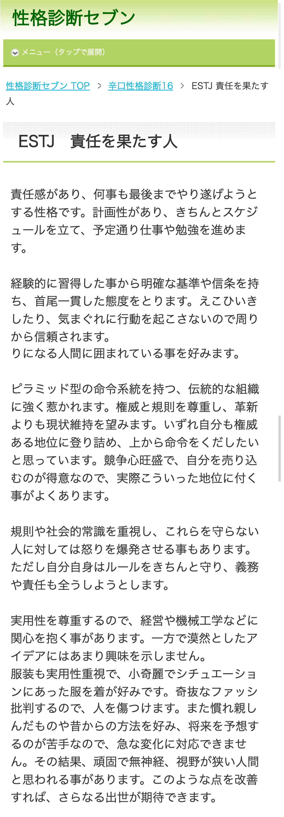質問数が非常に多いため時間がかかるが、診断結果の正確度合い・質ともに高い解説の項目数・量がとても多く参考になる。各性格指標(外向型45%内向型55%など)をパーセント表示してくれるほか、他サイトには見られない「恋愛・他のタイプとの相性」の解説が充実しており、知識を拡げたい人には参考になる。